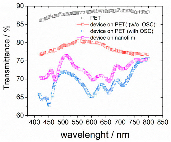 Thanks to the appropriate choice of materials, fabricated OFETs are significantly transparent. In order to quantify the actual transparency, absorbance tests have been carried out in the visible spectra (400–800 nm). Results are summarized in Figure 5, where transmittance is reported for complete devices fabricated both on PET and Parylene ultra-thin films. Devices have four well=defined absorption peaks (490, 600, 650 and 700 nm, see Figure S3 in Supporting Information), which are consistent with those typically reported for TIPS pentacene in different kind of solvents [42,43,44]. At these wavelengths, the transmittance is of about 70% for devices fabricated on PET, and of about 75% on Parylene C. It is worth noting that the transmittance of the transistor structure fabricated on PET before the semiconductor deposition exceeds 80%; if this data is compared with the transmittance of bare PET (85%), a relative transmittance of 94% can be derived for devices fabricated on PET without a semiconductor, which is reduced to 82% due to TIPS pentacene absorbance. Therefore, the actual transparency can be further improved by properly choosing a material more transparent than TIPS pentacene as the active layer.