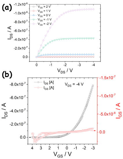 Among flexible organic devices, Organic Field-Effect Transistors (OFETs) are surely of great interest, as they can employed both as basic building blocks in electronic circuits [12,13,14] and as sensors [15,16,17]. In the bioelectronic scenario, peculiar optical and mechanical properties must be combined with low-voltage operation of the devices, in order to ensure portability and user safety. Although significant steps forward have been reported by the recent literature, the actual combination of low-voltage operation, transparency, flexibility and large-area fabrication processes is substantially missing. Indeed, several examples of transparent OFETs may be found in the literature [18,19,20,21,22] with moderately or even high operating voltages and fabricated over rigid substates, as well as low-voltage and transparent devices which are not flexible [23,24]. When flexibility and transparency are combined, moderately high voltages are reached or small-area fabrication processes are involved [25,26,27,28,29,30]. This is mainly related to the fact that low-voltage operation is generally reach by ensuring large gate insulator capacitance; this can be obtained by using high-k dielectrics [31] or reducing the gate insulator thickness. High-k materials, such as inorganic dielectrics, can be transparent and reasonably flexible, but normally requires high process temperatures, and are thus not suitable for the employment of most of the plastic substrates. Organic dielectrics can be processed at room temperature and by liquid phase, but low-voltage operation is allowed by depositing them in very thin films, as their dielectric constant is relatively low. Unfortunately, obtaining such thin films (generally in the range of a few tens of nanometers) is not trivial with large-area processes, and only a couple of examples have been reported so far in the literature. As a matter of fact, only a few examples combining low voltage operation, transparency and flexibility are available to date [32,33], but small-area techniques, such as spin-coating, still cover a central role in the fabrication process, e.g., for the deposition of a gate insulator layer thin enough to ensure low-voltage operation.