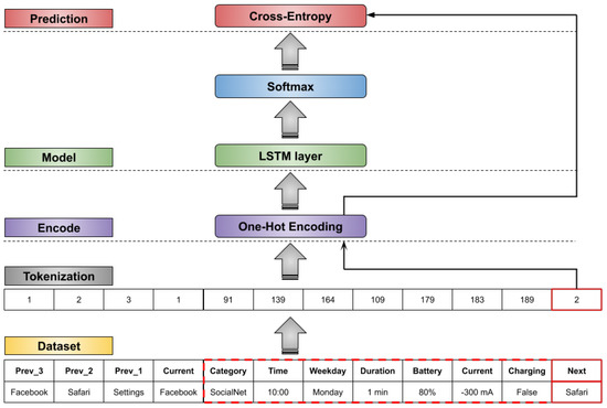 Our app prediction model is inspired by the LM using RNN. However, instead of using a sequence of words, we used the app usage records with their respective context features. The app category, time, duration, and battery information were the features used. As explored in [3,8], we aim to investigate the correlation between the apps and context features to improve the prediction results. For each app usage record, we include n number of previous apps used and the features regarding the current app record. The target is to predict the next app. Figure 1 shows an overview of our prediction model. The first part consists of arranging the app records with their respective previous apps, features, and future next app. After, it is necessary to convert these sequences elements into unique values. This process is called tokenization, which is covered in the following subsection.