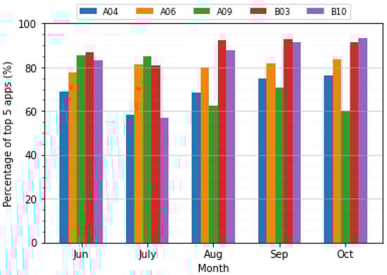 Since the data set is for an extended period, it interests to monitory the app usage behavior throw time steps. For instance, we can check periodically whether the users concentrate their app usage in a few apps or not. In Figure 3, it is shown the percentage of the top 5 apps used by 5 users from June until October. The top 5 apps percentage can change significantly during the months. Taking the A09 user from Figure 3, the top 5 apps represents 85% of all the records registered in June, while in October, this percentage drops to 60%. It indicates that the user changed from a few apps concentration to more balanced app usage. Even with this high variation, it is important to the prediction model account these 5 most-used apps. The reason is that the average percentage of the 5 most used apps for all the 34 users during the whole period is 74.75 %. Moreover, the top 5 apps are not constant over time. On average, 10 applications are among the five most-used applications over the user’s period.