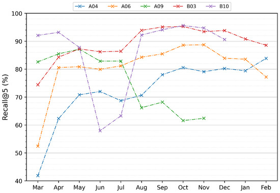 Recall@5 for each month for five users’ results using the NAP model.