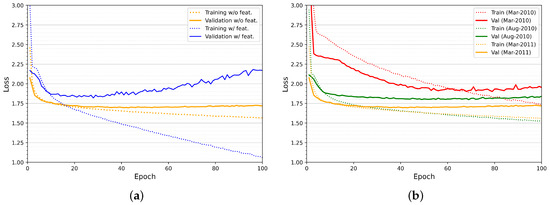 Cross-entropy loss for B09 user including and not including the features (a) and cross-entropy loss for B09 in different months not including the features (b).