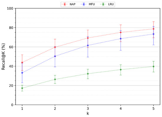Recall@k performance for NAP, LRU and MFU.