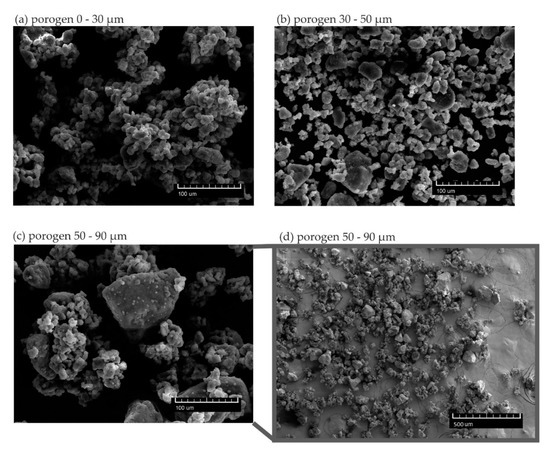 SEM microimages of NaCl particles that serve as a porogen: (a) 0–30, (b) 30–50, and (c) 50–90 µm. Image (d) is a lower magnification image of the 50–90 µm porogen.