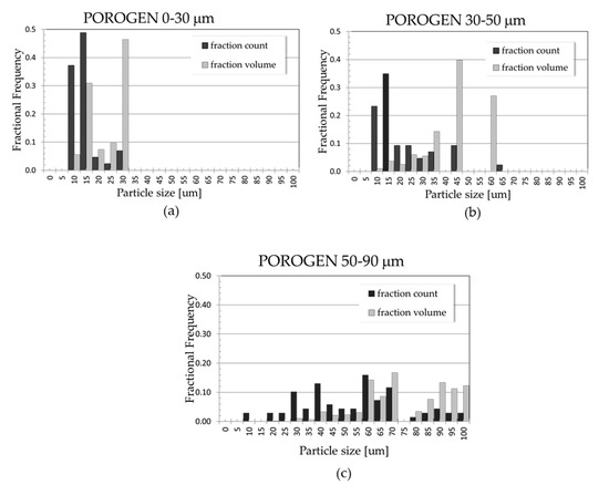 The analysis of the pore size distribution by the ImageJ software shows the increasing tendency of the pore size distribution with increasing porogen size for samples prepared with 0–30 and 30–50 µm-sized particles. Interestingly, as the size of the porogen increased, the span of the pores also increased, possibly due to the presence of small porogen particle “fine dust”, as described in the section: salt porogen features.
