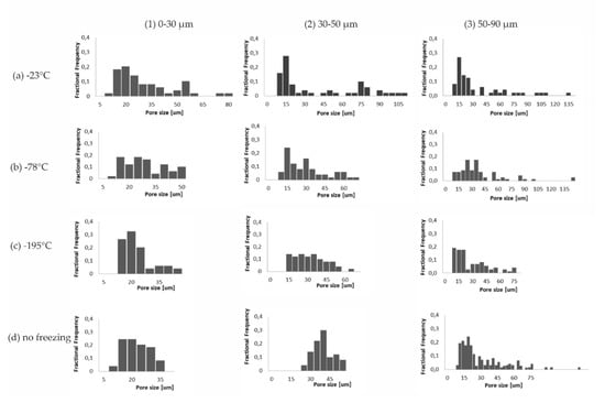 The largest pores were generated when swollen hydrogels were frozen at −23 °C. With the lowering of the freezing temperature, the pore size decreased—c.f., groups (b) and (c) in Figure 1. This effect corresponds to the freezing rate; when a faster freezing temperature rate is applied, smaller ice crystals are formed [25,36].