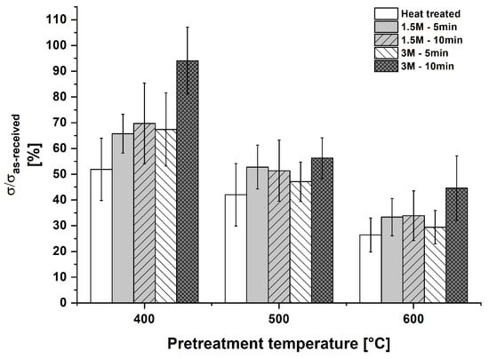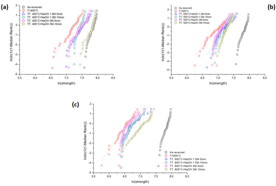 | Heat Treatment Temperature (°C) | Chemical Treatment with NaOH | Tensile Strength (MPa) | Weibull Modulus—ασ | Scale Parameter—σ0 (MPa) |