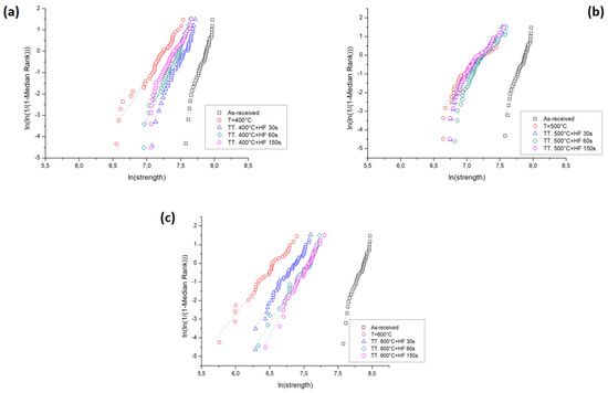 | Heat Treatment Temperature (°C) | Chemical Treatment with HF | Tensile Strength (MPa) | Weibull Modulus—ασ | Scale Parameter—σ0 (MPa) |