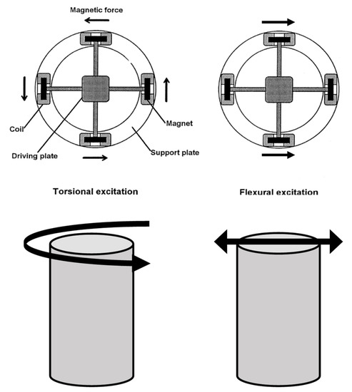 The resonant column test, including torsional and flexural modes (Figure 1), is commonly used to measure the resonant frequencies of specimens to obtain soil dynamic properties. High-frequency torsional or flexural vibrations are applied to the specimen by electromagnetic drive discs (EDDs), and the torsional/flexural resonant frequencies are detected at the corresponding strain. On the basis of the measured resonant frequency, the G or E of the soil is determined using the calculation formula. In general, torsional mode is commonly used because G and its reduction curve are indispensable properties in the site response analysis for propagating horizontal ground motions [1,2]. With the demand for the assessment of vertical ground movement under earthquake, E or constrained modulus and its reduction curve have become increasingly important [3,4,5].