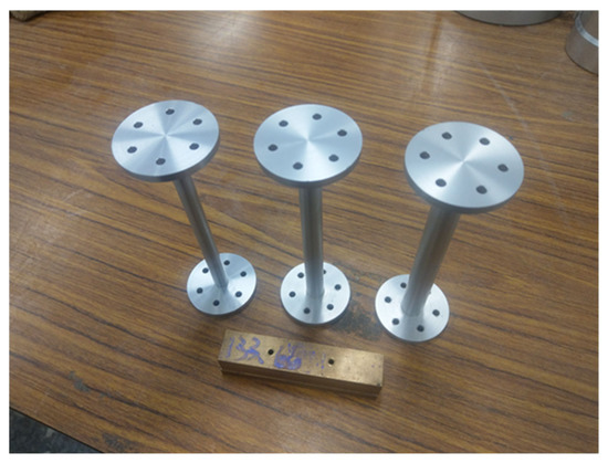 The GDS resonant column apparatus was utilized to perform the flexural test. The aluminum calibration rod provided by the GDS was used as a dummy specimen to verify the proposed calibration formula. Three aluminum calibration rods with different diameters (10, 12.5, and 15 mm) but similar height (140 mm) (Figure 4) were used to obtain an equivalent centroid position of the EDD. Three input voltages (0.02, 0.05, and 0.1 V) were applied for the flexural resonant test. The test results must be the same because the aluminum rod performs linearly under these voltages. For each voltage, the flexural resonant frequency was measured with and without the calibration block (0.134 kg) (Figure 4) as described in Section 2.1. In addition, the torsional mode test was performed to measure G and thus estimate ν. According to the information provided by the GDS, the properties of aluminum rods were as follows: shear modulus of 26 GPa, Young’s modulus of 69 GPa, and Poisson’s ratio of 0.33.