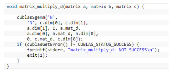 For floating-point matrix-matrix/vector multiplication, we directly deploy the cuBLAS-SGEMM library in function. One of these functions is shown in Figure 1. The formal parameter in the function is the previously defined matrix structures, including the matrix parameters, such as matrix header pointers and dimensions.
