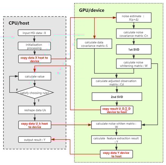 In some other parallel processing of the hyperspectral image, GPU acceleration is mostly performed only for matrix operations [] or using the CPU computing library for feature decomposition []. In our algorithm, we will perform feature decomposition in GPU based on the cuSolver library and reduce data transfer between the host and the device as much as possible.