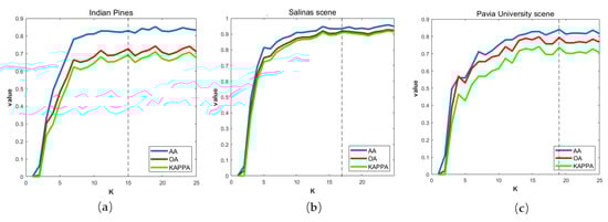 Then we evaluate the choosing rules from the perspective of classification effect and verify the validity of feature extraction, where we choose CMR-SVM [] for the classifier. As for the classification effect, several metrics have been used to measure the classification accuracies []. Accuracy is essentially a measure of how many ground truth pixels were classified correctly (in percentage), average accuracy (AA) is the average of the accuracies for each class, and overall accuracy (OA) is the accuracy of each class weighted by the proportion of test samples for that class in the total training set. Kappa statistic (Kappa), computed by weighting the measured accuracies, is a measure of agreement normalized for chance agreement.