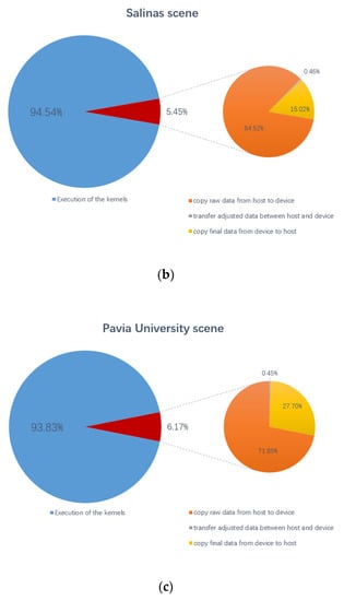 Percentages of the total GPU time for kernel execution and data transfers. (a) Indian Pines; (b) Salinas scene; (c) Pavia University scene.