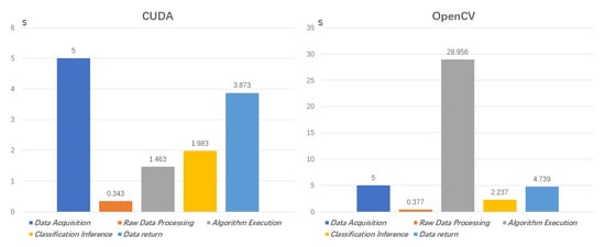 As shown in Figure 11 and Figure 12, The data acquisition time is fixed at 5 s and is determined by the camera. After the camera scans (data acquisition), it quickly generates a raw data file in the file system, which is then read by our algorithm as the input. The span of the raw data processing is stable and not time-consuming. Then enter the algorithm execution, as the spatial dimension of hyperspectral data increases, our parallel implementation can always control the algorithm execution within one second and a half, accounting for only about 10% of the total duration, but the OpenCV version of the algorithm process time cost increases rapidly, and takes up about 70% of the total time, which exceeds 40 s. It can be seen that our parallel strategy dramatically reduces the total time, and the total time is dominated by the fixed time of the entire platform, rather than our algorithm itself, which significantly increases the real-time processing capabilities and effects. Considering that the fully loaded safe flight time of the UAV is only 15 min, it has a high practical effect and significance.