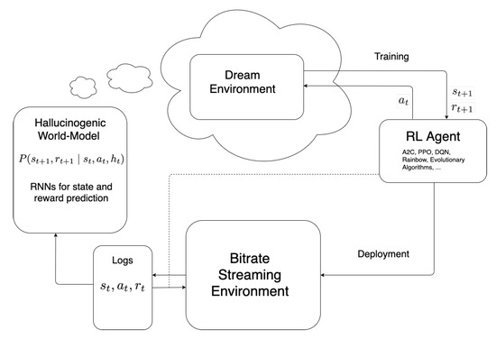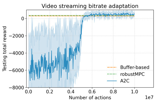 - Mao, H.; Netravali, R.; Alizadeh, M. Neural Adaptive Video Streaming with Pensieve. In Proceedings of the Conference of the ACM Special Interest Group on Data Communication, Los Angeles, CA, USA, 21–25 August 2017; pp. 197–210. [Google Scholar]
