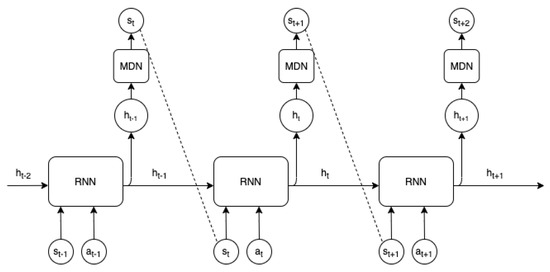 A state predicting Mixture Density Network with a Recurrent Neural Network (MDN-RNN). Figure adapted from [5].