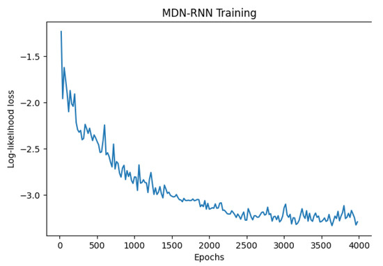 Ha & Schmidhuber [5] first used a variational autoencoder to compress the state space s into a latent vector z, and learned a world model with this compressed version of the state space. The authors train an MDN-RNN to model , where is the action take at time t, is the state of the environment that is encoded as a latent vector at time t, and is the hidden state of the MDN-RNN at time t. The world model is trained using recorded episodes in the teacher forcing method, where the inputs to the MDN-RNN model in training only consist of the ground truth at each step. Sampling only occurs during the training of the controller. For inference, the MDN-RNN uses a softmax layer on the output ’s to form a categorical distribution. The softmax function, , converts a vector of numbers into a probability distribution, where each component is in the interval (0,1) and the entire vector sums to 1. A sample drawn from this distribution determines which Gaussian distribution pair, (), is used to sample the actual output. Ha & Schmidhuber [5] additionally incorporate a temperature hyperparameter , which is used to adjust the randomness during sampling. The logits, components of the vector before the application of the softmax function, are divided by the temperature parameter before being scaled into probabilities. is typically set between 0 and 1; however, larger values are used in practice. When trends to zero, the output of the MDN-RNN becomes deterministic, and samples only consist of the most likely point in the probability density function. Lower temperature values make sampling more conservative, and the unlikely candidates become even more unlikely to be sampled. Conversely, higher temperature values make unlikely candidates more likely to be sampled, which results in more stochastic predictions.