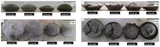 The aerated samples after demoulding are shown in Figure 1. It can be seen in the figure that all TGPFs have one common property, namely, the expansion of foams decreases with the increasing BA content or decreasing liquid/solid ratio. However, the samples cured up to 500 °C were easy to demould. Demoulding was easiest for samples cured at lower temperature (e.g., 200 °C) and more difficult for samples cured at 600 °C. Samples cured at 600 °C were broken after demoulding, as shown in Figure 1d. Due to the transition at a viscous sticking phase above 500 °C, these samples were strongly stuck onto the walls of the moulds and were difficult to demould. Above 500 °C, the system crossed its glass transition temperature [16], therefore due to viscous flow, densification and strengthening occurred.