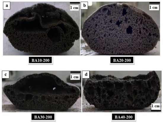 The cross-sections of samples cured at 200 °C are shown in Figure 2. From these cross-sections, it is clear that the expansion of TGPF was maximized with the high SS content and decreased with higher bottom ash content. A domed portion at the top can be seen which was cut from the samples, and only the bottom portions of the samples were used for the characterization of TGPFs. It can be seen from Figure 2a,b that the porosity was uniformly distributed in the BA10-200 and BA20-200 samples because these compositions contained higher percentages of foaming agent(SS), and the liquid/solid ratio was higher, which helped with uniform porosity. In the samples BA30-200 and BA40-200, the foamability was somewhat nonuniformly distributed, as shown in Figure 2c,d, because these compositions had lower percentages of the foaming agent and a lower liquid/solid ratio. These two samples showed pores of different sizes. Interconnected porosity can easily be seen in all these samples.