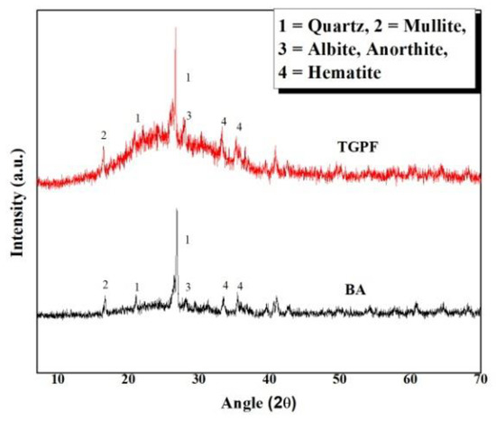 A hump can be seen in the pattern of the TGPF between 15°–40°(2θ) which is absent in the pattern of the BA. It is attributed to the glassy phase in the TGPF derived from the transformation of SS in a vitreous foam. The four phases from BA patterns (i.e., quartz, mullite, anorthite, and hematite) are also present in the TGPF. The anorthite peak of the TGPF is slightly higher than that of the BA, which indicates that geopolymerization has occurred with the formation of anorthite hydrate [16,17]. The peak of quartz in both the patterns is high, but it is slightly higher in TGPF than for BA.