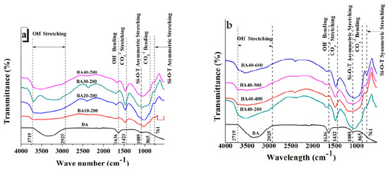 It can be seen from Figure 5b that the peaks of Si-O-T asymmetric stretching bonds of BA40-200 and BA40-600 have been shifted more towards lower wavenumbers and are also deeper, as compared to the peaks of BA40-400 and BA40-500. This shows that the degree of geopolymerization is higher in BA40-200 and BA40-600 than in BA40-400 and BA40-500.