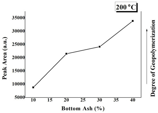 Figure 6 is a plot of calculated peak areas of the Si-O-T asymmetric stretching bonds appearing in the FTIR curves of TGPFs in Figure 5a versus BA content. The peak area of the asymmetric stretching bond is a measure of the degree of geopolymerization [10,18]. It can be seen from Figure 6 that as the BA content increases, the peak area of the asymmetric stretching bonds increases, and hence the degree of geopolymerization increases with the increasing BA content at a constant CT.