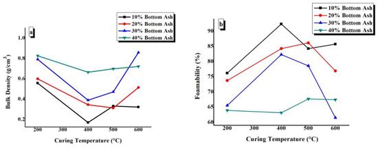 The calculated values of bulk density and foamability were plotted against BA content at various CTs, as shown in Figure 7. It can be seen from Figure 7a,b that there is a general trend of increasing bulk density and decreasing foamability with an increase in BA content at each CT. Figure 7a,b shows that the minimum bulk density and maximum foamability are presented by TGPFs cured at 400 °C and 500 °C, as can be seen from 400 °C and 500 °C curves.. There is an exception at 600 °C, where the bulk density decreases when we increase BA content from 30% to 40%. The higher density in samples treated at 600 °C is attributed to the viscous sintering which takes place above glass transition temperature of sodium silicate.
