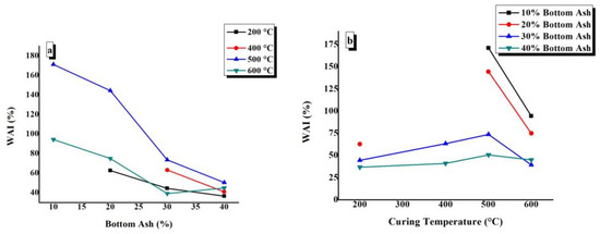 WAI values of TGPFs were plotted against BA and CT, as shown in Figure 9. The constant CT and BA content are indicated in the top right corner of the graphs. Figure 9a shows that the points of BA10-200, BA10-400, and BA20-400 are absent because these samples decomposed or dissolved completely after 48h in water due to the solubility of the SS. It can be seen from Figure 9a that WAI values decrease as the bottom ash content increases at all of the curing temperatures. With the increase in the bottom ash content, the foamability of the TGPFs decreased, and the WAI is directly related to the foamability of TGPFs, hence the WAI decreased with increased bottom ash content. At 600 °C, WAI increases as the bottom ash content increases from 30% to 40%. This behaviour is due to the irregular foaming presented by 40%BA composition when cured at 600 °C, as discussed earlier, and is in accordance with the decrease in bulk density and increase in foamability as the BA is increased from 30% to 40% at 600 °C curing temperature, as was mentioned earlier in 4.4. Figure 9a shows that the maximum WAI values are obtained at 500 °C CT for all the compositions, as can be seen from the 500 °C curve.