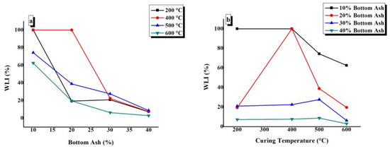 Effect of (a) bottom ash content and (b) curing temperature on the WLI of TGPFs.