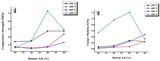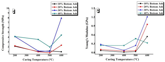 It can be seen from Figure 11 that there is a general trend of increasing compressive strength and Young’s modulus with increasing BA or decreasing liquid/solid ratio at all CTs, with an exception of a decrease in compressive strength and Young’s modulus values at 600 °C as we increase BA content from 30% to 40%, which is due to irregular foaming of 40% BA composition cured at 600 °C; this result is in accordance with the bulk density values, as bulk density also decreases when BA content is increased from 30% to 40% at 600 °C CT, as mentioned earlier in 4.4. Figure 11 shows that the maximum compressive strength and Young’s modulus values are presented by the TGPFs cured at 600 °C. The maximum Young’s modulus values at the curing temperature of 600 °C suggests the catastrophic failure of TGPFs cured at 600 °C, and this effect was observed during the mechanical testing. The curves at 400 °C and 500 °C CTs shows the minimum compressive strength and Young’s modulus. This behaviour is in accordance with the bulk density, WLI, and FTIR analysis results, which show the minimum degree of geopolymerization for TGPFs cured at 400 °C and 500 °C, as shown earlier in Figure 5b.