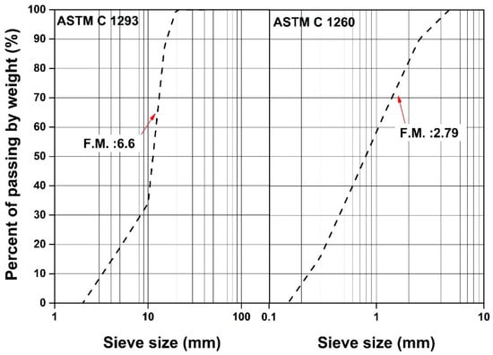 Several studies have been performed to develop accelerated test procedures to determine the potential alkali-silica reactivity of aggregate []. The accelerated alkali-silica reaction test method using mortar bars was originally proposed by Oberholster and Davis in 1986 [,]. It is the most widely used method to evaluate the potential alkali-silica reactivity of aggregate [,,]. Mortar bars with a water-binder (i.e., W/B) ratio of 0.47 and a sand-binder (i.e., S/B) ratio of 2.25 were fabricated. The particle size distribution of the aggregate was in conformance with the ASTM C 1260 standard []. The grading curves of the aggregates are shown in Figure 1.