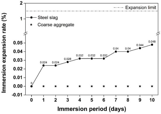 Before steel slag can be used as aggregate in concrete, an immersion expansibility test must be performed. The immersion expansion ratio of the steel slag must be below 1.5% to satisfy the required criteria. The steel slag was prepared according to the JIS A 5015 standard [], to determine its immersion expansion using a direct method. Initially, the steel slag was immersed in water at 80 °C for six hours, and stored in a constant temperature chamber. Subsequently, the chamber was maintained at 20 °C for eighteen hours. This process was repeated for 10 days and the steel slag volume change was determined by using a calibrated indicator (resolution: 0.01 mm). It is the average of the values recorded after three iterations.