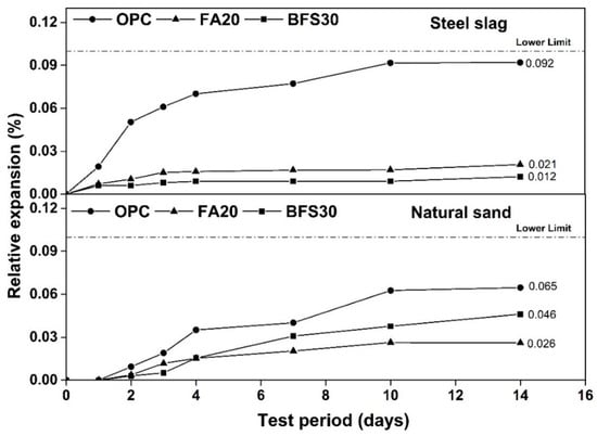 The results of the ASR expansion test are shown in Figure 3. The results indicate that the expansion ratios noticeably increased with the increase in the test period. The expansion of the mortar bars with steel slag was higher than that of the mortar bars with natural aggregate. However, the expansion was within the permitted limit at 14 days, even in the specimens that only used OPC as the binder. Therefore, according to the ASTM C 1260 standard [], both the steel slag and natural fine aggregate specimens had stable ASR expansion.