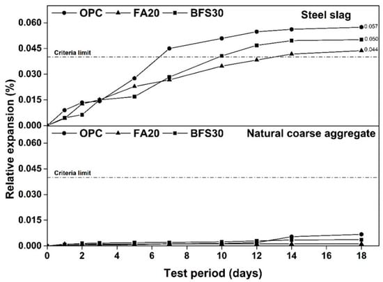 In the concrete specimens using steel slag as coarse aggregate, the expansion rate gradually increased for a 7 days of the test period. However, after 12 days, the expansion rate slowed down considerably and proceeded at a gradual rate. In the specimens with OPC as the binder, the expansion exceeded the permitted limit of 0.04% after 7 days. Furthermore, in contrast to the test results obtained using the ASTM C 1260 standard [], the addition of mineral admixtures did not significantly reduce expansion, which exceeded the permitted limit after 10 days. Remarkably, even blast furnace slag, with its high specific surface area, was unable to sufficiently reduce and control the expansion of concrete using steel slag aggregate. Thus, considering the ASTM C 1293 [] test results, additional methods are required to decrease the expansion of the concrete specimens.