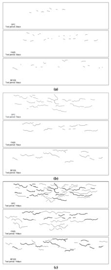 The typical crack progression patterns recorded during the test are shown in Figure 5. As shown, all concrete specimens, regardless of the type of binder, exhibited ASR cracking. Moreover, the number of cracks and their thickness increased during the test period, growing horizontally. Figure 5a shows the crack map of the concrete specimens at the time of crack initiation. Although the expansion rate was still below the permitted limit, all the concrete specimens exhibited ASR cracking. The specimen with the OPC binder experienced crack initiation earlier than the specimens with mineral admixtures, exhibiting a trend that is similar to be measured expansion rate. The expansion values of the specimens with FA20 and BFS30 were similar after 3 days, however, crack initiation in the concrete with FA20 occurred earlier than that in the concrete with BFS30. Thus, BFS30 offers the highest resistance against ASR cracking in concrete specimens using steel slag aggregate. Figure 5b shows the crack patterns after the first 7 days of the test period. In the specimens using OPC binder, most of the cracks after 7 days were due to expansion beyond the permitted limit. The crack patterns and expansion in the specimens with the value of FA20 and BFS30 were similar.