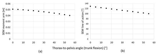 Among the limitations of this approach, the fixed moment arm of the back-extensor muscles is surely a critical point, as it has been shown that applying the lever arm obtained in an upright stance to a flexed position leads to a significant underestimation and overestimation of the compression and shear forces, respectively [15]. The orientation of the muscle’s line of action (crucial for projecting the muscle force on the vertebral body properly), assumed to be parallel to the axis of compression and characterized by a constant value, has even worse effects [15]. In their single-equivalent muscle (SEM) model, van Dieen and de Looze predicted the back extensor muscle moment arm and the orientation of their line of action (with respect to the plane of L5/S1) as a function of the thorax-to-pelvis angle from 10° of trunk extension to 55° of flexion with a resolution of 5° [15] (Figure 1). The regression was based on a model consisting of 114 muscles crossing L5/S1 [16].