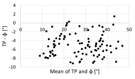Bland–Altman plot for visually inspecting the presence of heteroscedasticity (i.e., linear trend) in the dataset. The plot depicts the differences (error) between the angle of the thorax relative to the pelvis (TP) and φ against the respective means.