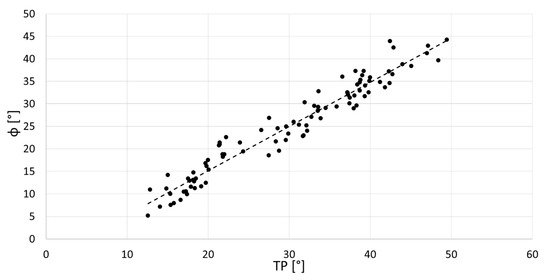 The TP computed from the available dataset during stoop and squat lifting tasks (number of datapoints = 94) ranged from 5° to 44°. No heteroscedasticity was suspected from a visual inspection of the Bland–Altman plot (Figure 4), and Kendall’s τ was found to be <0.1. A strong association was found between TP and φ (r = 0.970, p < 0.0001) (Figure 5), and no statistically significant differences were revealed by Student’s t-test between TP and φ (p < 0.0001).
