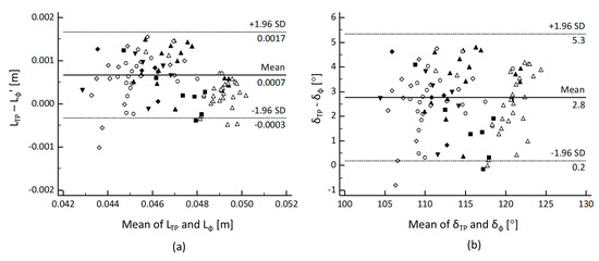 Finally, the prediction of δ by using φ resulted in an average absolute error of 2.7° ± 1.3° (2%), which corresponds, approximately, to the variation of δ with TP according to van Dieen’s model (Figure 1b). For this reason, no correction was considered as needed for δφ. A strong correlation (r = 0.970, p < 0.0001) as well as high agreement (bias = 2.8°, uLOA = 5.3° and lLOA = 0.2°) were found between δTP and δφ (Figure 7b).