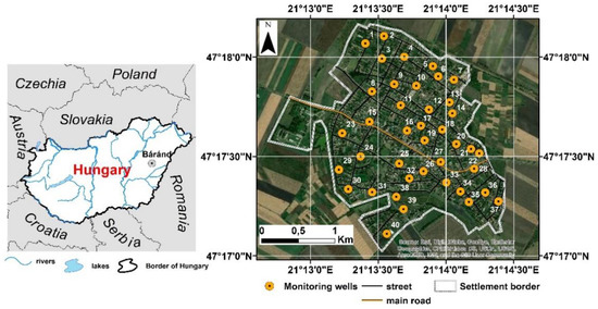 Báránd municipality is located in the eastern part of the Great Hungarian Plain (Figure 1). According to our calculations, over the past few decades, 30–40% of the domestic wastewater generated (appr. 120,000 m3 every year) could have seeped into the soil and groundwater [46]. This significant pollution discharge has caused heavy contamination in the settlement [47]. In 2014 a sewage system was constructed in the settlement and therefore the majority of the local sources of contamination were eliminated [48]. During the data collection, 40 groundwater wells were investigated and an environmental database was created. In the sampling process—performed in the summer of 2013 (before the construction of the sewage system) and 2019 (after the construction of the sewage system)—the upper 1 m water surface of the groundwater wells was sampled. The NO3− and PO43− content of the collected water samples was determined by the appropriate procedures of the Hungarian Standard [49,50].