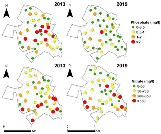Spatial distribution of phosphate and nitrate values in the investigated wells.