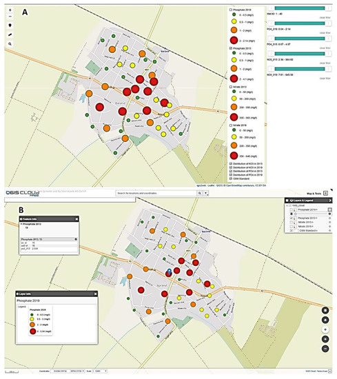 We attached an optional OSM (OpenStreetMap) Standard basic map to the visual representation of the vector and raster databases imported into the QGIS environment equipped with unique symbols (Figure 3). After setting the parameters of the modules, we generated two classic third-generation web maps. The classified vector layers show the nitrate and phosphate values according to the Hungarian Standard with graduated symbols in a third-generation web map (Figure 4A,B). As the default setting, the loaded web map shows the classified database which can be freely zoomed in and out, and the length of the specified routes can be calculated. In addition to navigating on the map, we can control the visibility of each layer. Furthermore, there is a Search by location function integrated into the interactive surface which we can use to navigate to the desired geographical location in the web map, thereby informing the user about the spatial distribution of the pollution level. The visibility of the layers can also be controlled by use of the menu located in the right upper corner. Information about the layers can be queried by clicking, and results showing the appropriate data from the attribute table are visible to users in a window and in the interactive query interface.