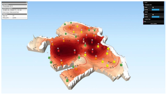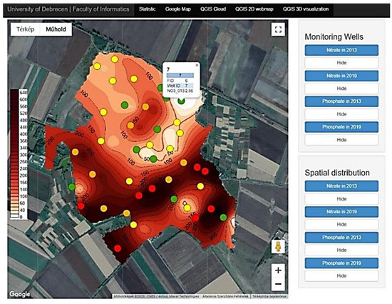 The base of the 3D interpretation was the ASTER GDEM (Advanced Spaceborne Thermal Emission and Reflection Radiometer Global Digital Elevation Model) raster digital surface model. The distribution map and monitoring wells storing the investigated water chemical properties were inserted onto this model by time points projected onto the model, which can be rotated arbitrarily, as well. Information about the layers can be queried by clicking, and results showing the appropriate data from the attribute table are visible to users in a window. The visibility of the layers can also be controlled by use of the menu located in the right upper corner (Figure 7).