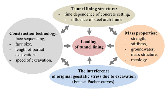 The load on the primary lining is determined by the interaction of the lining with the surrounding soil or rock mass. This interaction depends on numerous factors. Before excavation and the building of the tunnel lining, the rock mass is in an original equilibrium state of strain–stress. This equilibrium is disrupted by tunnel construction, and the strain–stress changes itself to a new equilibrium status. The purpose of the primary lining is to allow a certain amount of radial deformation in the excavation, which reduces the final load on the lining. This interaction and its input factors are presented in Figure 2, which indicate that the load on the primary lining is highly complex and affected by many factors.