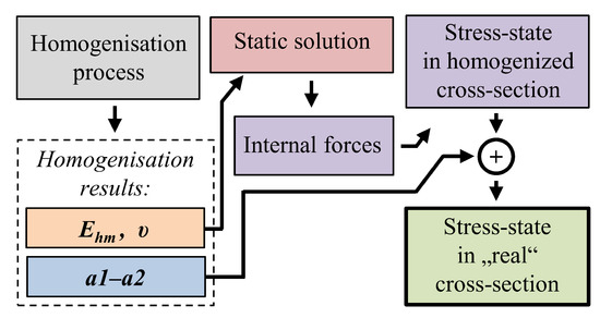 The cross-sectional homogenisation provides the lining deformation characteristics (elastic modulus for homogenised cross-section , Poisson’s ratio for homogenised cross-section ) and redistribution coefficients and . The numerical solution results in the quantification of the homogenised lining cross-section loading according to the internal forces. Then, using the redistribution coefficients and , the tangential stress of the homogenised lining cross-section can be converted into the stresses in individual elements, i.e., the steel arch frame and shotcrete. The proposed solution is described in Figure 4.