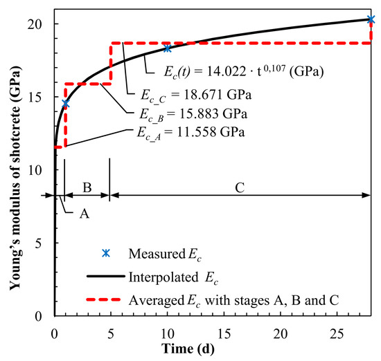 The development time axis was divided into three intervals A, B and C, which were assigned a representative average value of the elastic modulus of shotcrete in the given solidification stage (Figure 8). The representative value of shotcrete corresponding to construction stages A, B and C was determined as the arithmetic average of discrete values divided by the time axis by 0.1 d in the set time interval of the relevant stage, as follows: