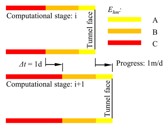 Figure 9 presents the construction stages in the numerical model. The figure clearly shows the gradual increase in the elastic modulus of the homogenised lining Ehm, which was due to shotcrete solidification.