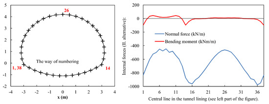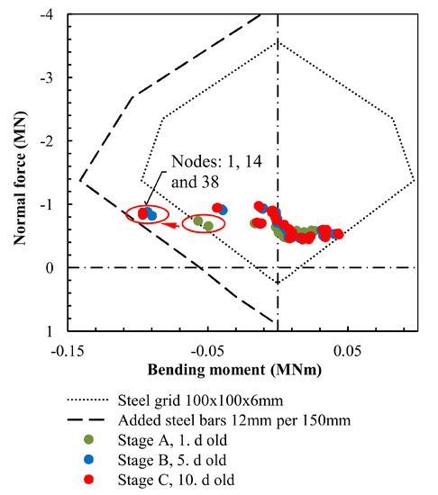 Figure 10 presents an interaction diagram for the solved lining, disregarding the reinforcement arches. The reinforcement arch was only applied in the numerical model for the stiffness of the primary lining.