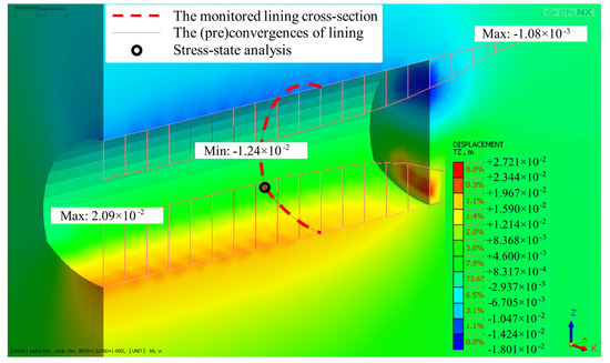 This paper would be complete with regard to assessing the primary lining according to EC7 [14] and EC2 [25]. Although the assessment was not performed for all stages of shotcrete curing (particularly up to 28 d), this approach is presented in an exhaustive manner. Additional steps emulate previous steps depending on the number of construction stages of the lining (shotcrete curing), the driving technology (division of the tunnel face, length of burdens, etc.) and the level of simplification applied to the numerical model. Figure 12 depicts the vertical deformations in the numerical model corresponding to construction stage B. The distance between the tunnel face and the cross-section of interest (dotted red line) of the lining was 5 m. Thus, the distance between the tunnel face and the model edge was 15 m. The red continuous line represents the excavation convergence, i.e., pre-convergence in the section before the tunnel face.